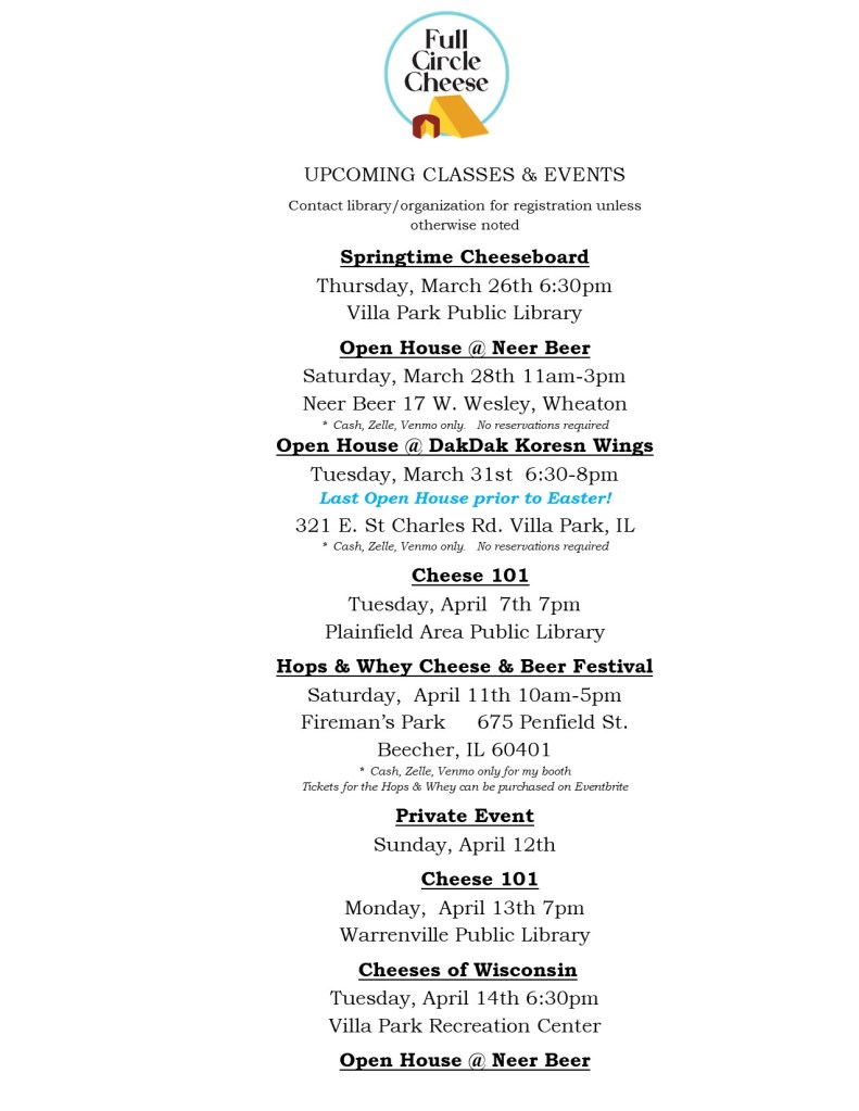 Full Circle Cheese offers a variety of classes at various locations such as Libraries, Breweries, Bars, and Kitchens.